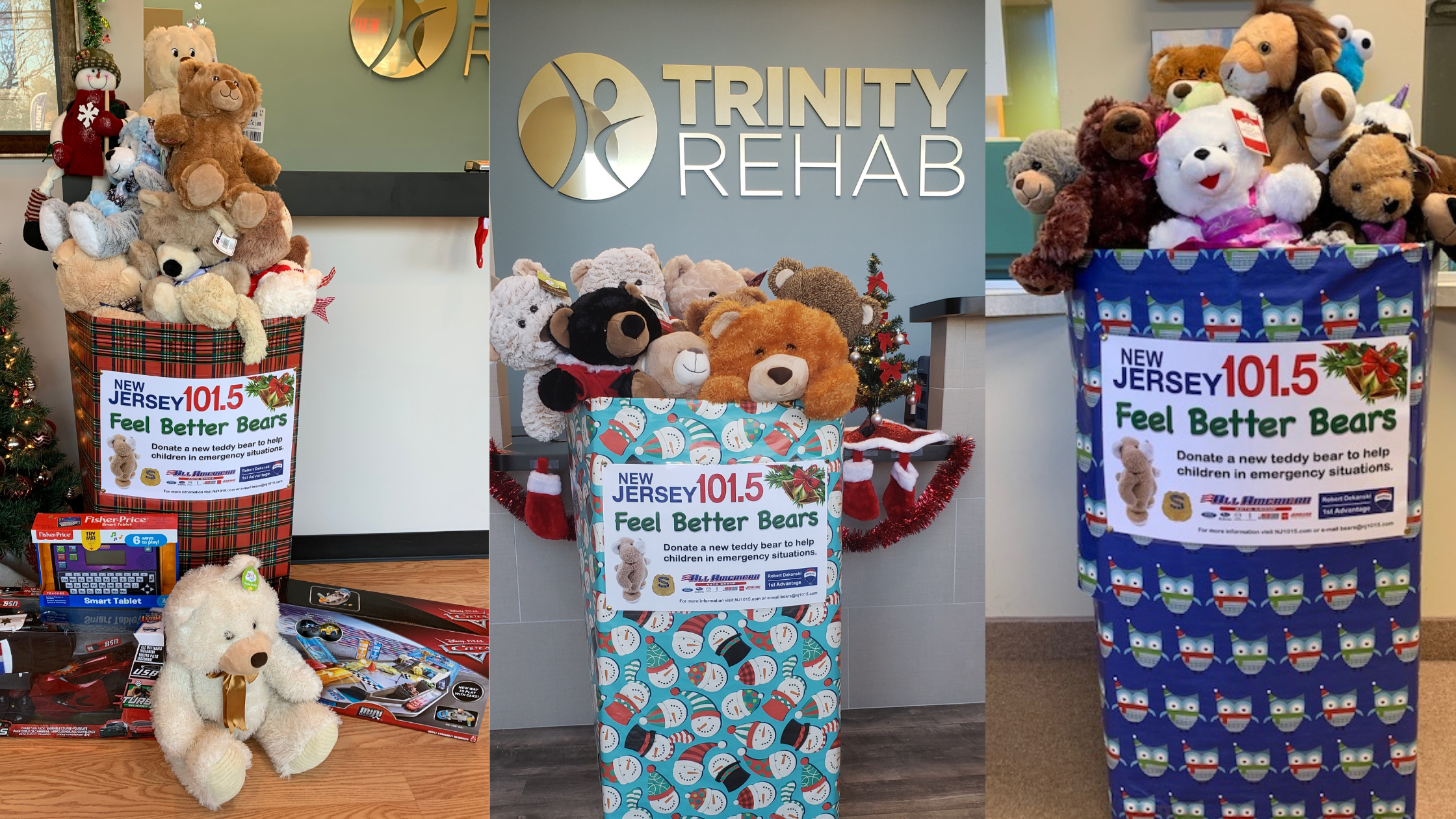Trinity Rehab will again join New Jersey 101.5 and its Feel Better Bears campaign, bringing comfort for children in crisis this holiday season. For the third year in a row, the company will host collection locations at six (6) facilities across the State, including East Brunswick, East WindsorMatawan, Metuchen, Paramus and one of its newest sites in Clifton. Donations of new, unwrapped bear or small  stuffed animals may be dropped off from now through Friday December 18th and these “Feel Better Bearswill be  distributed by the New Jersey State Policeman’s Benevolent Association to make children feel better during  emergencies with something to hug.